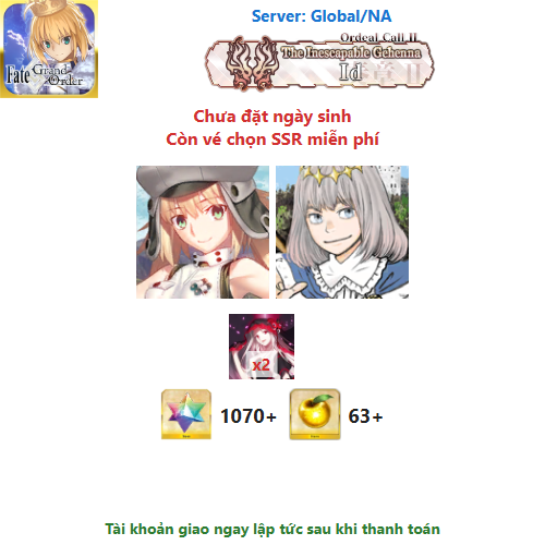 Tất cả các tài khoản FGO NA Endgame tại shop đều sử dụng tool/mod để vượt qua phần cốt truyện, nhằm tích lũy thêm nhiều đá và vé. Vì vậy, mọi người cân nhắc kỹ lưỡng những rủi ro có thể phát sinh trước khi quyết định mua tài khoản.