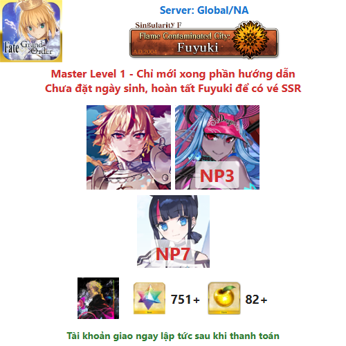 ⚠️ Vì tài khoản chưa hoàn tất chương đầu là Fuyuki, nên sẽ chưa có vé chọn SSR miễn phí, mọi người mua về chơi xong chương đầu sẽ có.