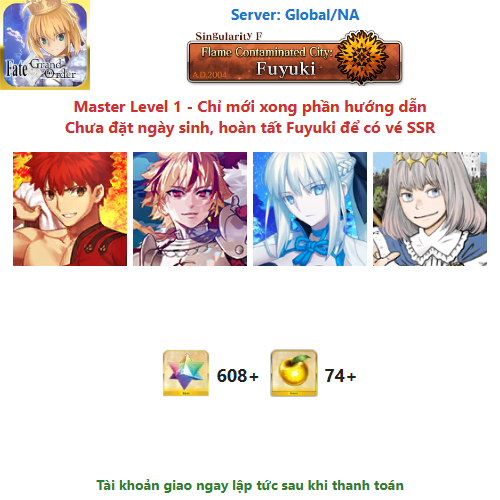 ⚠️ Vì tài khoản chưa hoàn tất chương đầu là Fuyuki, nên sẽ chưa có vé chọn SSR miễn phí, mọi người mua về chơi xong chương đầu sẽ có.
