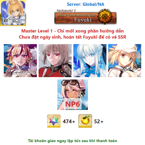⚠️ Vì tài khoản chưa hoàn tất chương đầu là Fuyuki, nên sẽ chưa có vé chọn SSR miễn phí, mọi người mua về chơi xong chương đầu sẽ có.