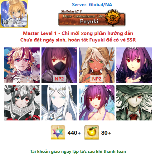 ⚠️ Vì tài khoản chưa hoàn tất chương đầu là Fuyuki, nên sẽ chưa có vé chọn SSR miễn phí, mọi người mua về chơi xong chương đầu sẽ có.