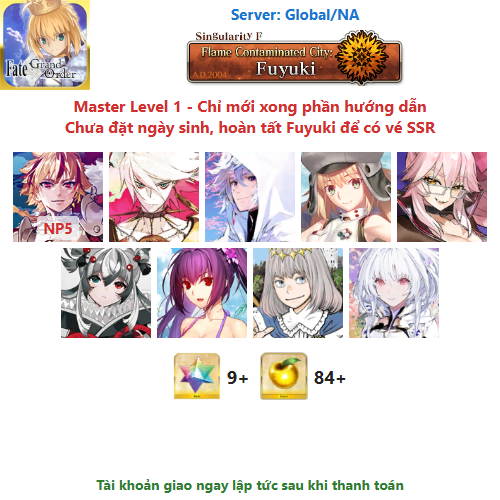 ⚠️ Vì tài khoản chưa hoàn tất chương đầu là Fuyuki, nên sẽ chưa có vé chọn SSR miễn phí, mọi người mua về chơi xong chương đầu sẽ có.