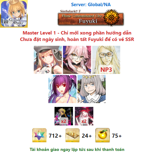 ⚠️ Vì tài khoản chưa hoàn tất chương đầu là Fuyuki, nên sẽ chưa có vé chọn SSR miễn phí, mọi người mua về chơi xong chương đầu sẽ có.