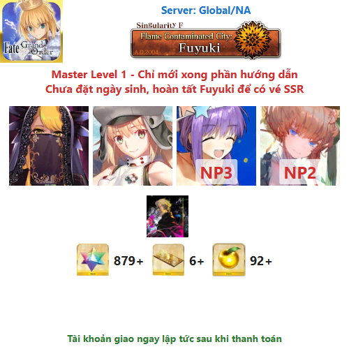 ⚠️ Vì tài khoản chưa hoàn tất chương đầu là Fuyuki, nên sẽ chưa có vé chọn SSR miễn phí, mọi người mua về chơi xong chương đầu sẽ có.