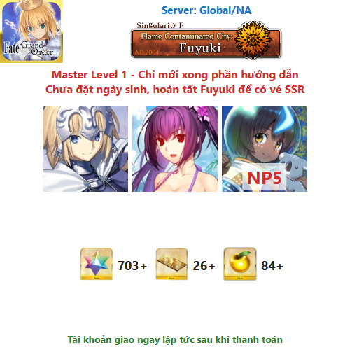 ⚠️ Vì tài khoản chưa hoàn tất chương đầu là Fuyuki, nên sẽ chưa có vé chọn SSR miễn phí, mọi người mua về chơi xong chương đầu sẽ có.